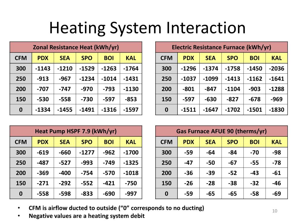 Heating System Interaction • CFM is airflow ducted to outside (“0” corresponds to no ducting) • Negative values are a heating system debit