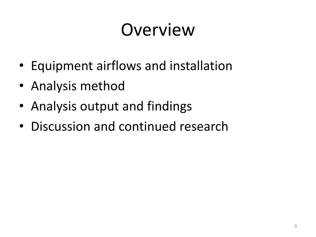 Overview • Equipment airflows and installation • Analysis method • Analysis output and findings • Discussion and continued research