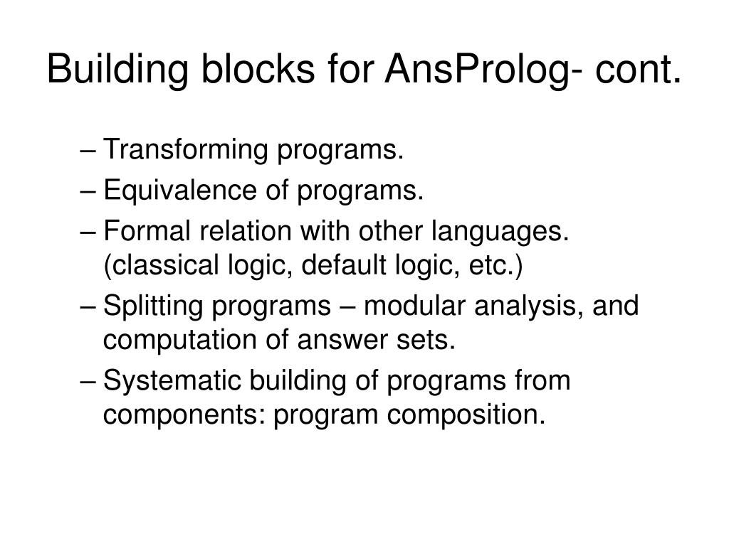 Building blocks for AnsProlog- cont. • Transforming programs. • Equivalence of programs. • Formal relation with other languages. (classical logic, default logic, etc.) • Splitting programs – modular analysis, and computation of answer sets. • Systematic building of programs from components: program composition.
