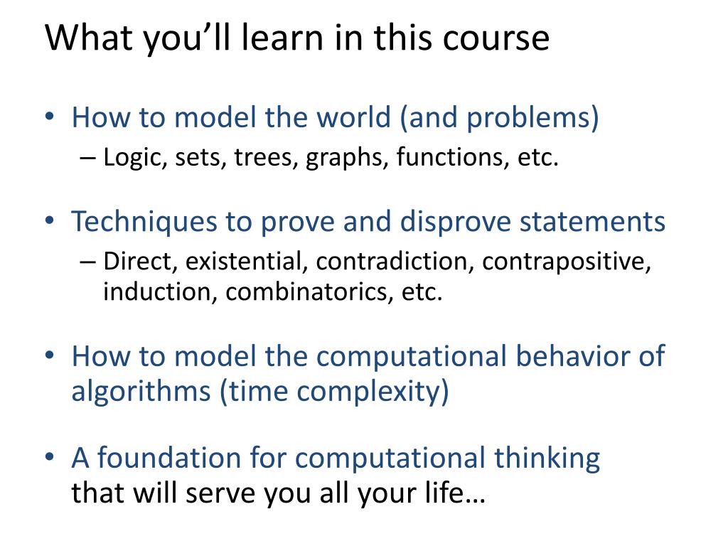 What you’ll learn in this course • How to model the world (and problems) • Logic, sets, trees, graphs, functions, etc. • Techniques to prove and disprove statements • Direct, existential, contradiction, contrapositive, induction, combinatorics, etc. • How to model the computational behavior of algorithms (time complexity) • A foundation for computational thinking that will serve you all your life…