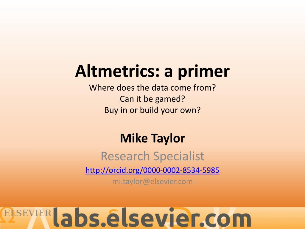 Altmetrics : a primer Where does the data come from? Can it be gamed? Buy in or build your own?. Mike Taylor Research Specialist http://orcid.org/0000-0002-8534-5985 mi.taylor@elsevier.com. Some words on terms.