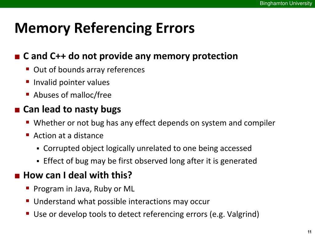 Memory Referencing Errors • C and C++ do not provide any memory protection • Out of bounds array references • Invalid pointer values • Abuses of malloc/free • Can lead to nasty bugs • Whether or not bug has any effect depends on system and compiler • Action at a distance • Corrupted object logically unrelated to one being accessed • Effect of bug may be first observed long after it is generated • How can I deal with this? • Program in Java, Ruby or ML • Understand what possible interactions may occur • Use or develop tools to detect referencing errors (e.g. Valgrind)