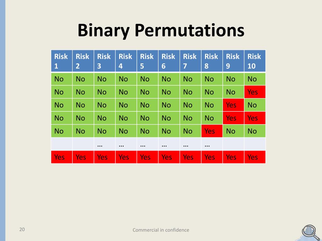 Binary Permutations EVERY RISK OR DELAY YOU CAN REMOVE REDUCE COMBINATIONS BY 2n Commercial in confidence