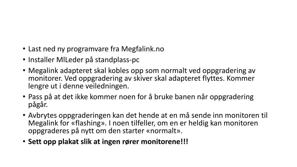 Oppgradere monitorer og skiver. Megalinksystemet . Last ned ny programvare fra Megfalink.no Installer MlLeder på standplass-pc Megalink adapteret skal kobles opp som normalt ved oppgradering av monitorer. Ved oppgradering av skiver skal adapteret flyttes. Kommer lengre ut i denne veiledningen.
