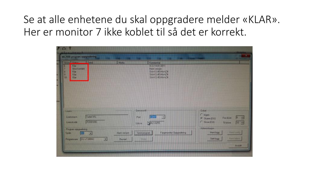 Se at alle enhetene du skal oppgradere melder «KLAR». Her er monitor 7 ikke koblet til så det er korrekt.