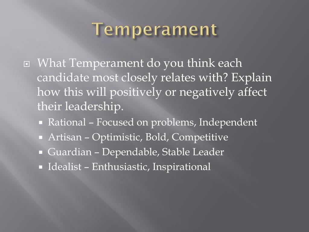 Temperament • What Temperament do you think each candidate most closely relates with? Explain how this will positively or negatively affect their leadership. • Rational – Focused on problems, Independent • Artisan – Optimistic, Bold, Competitive • Guardian – Dependable, Stable Leader • Idealist – Enthusiastic, Inspirational