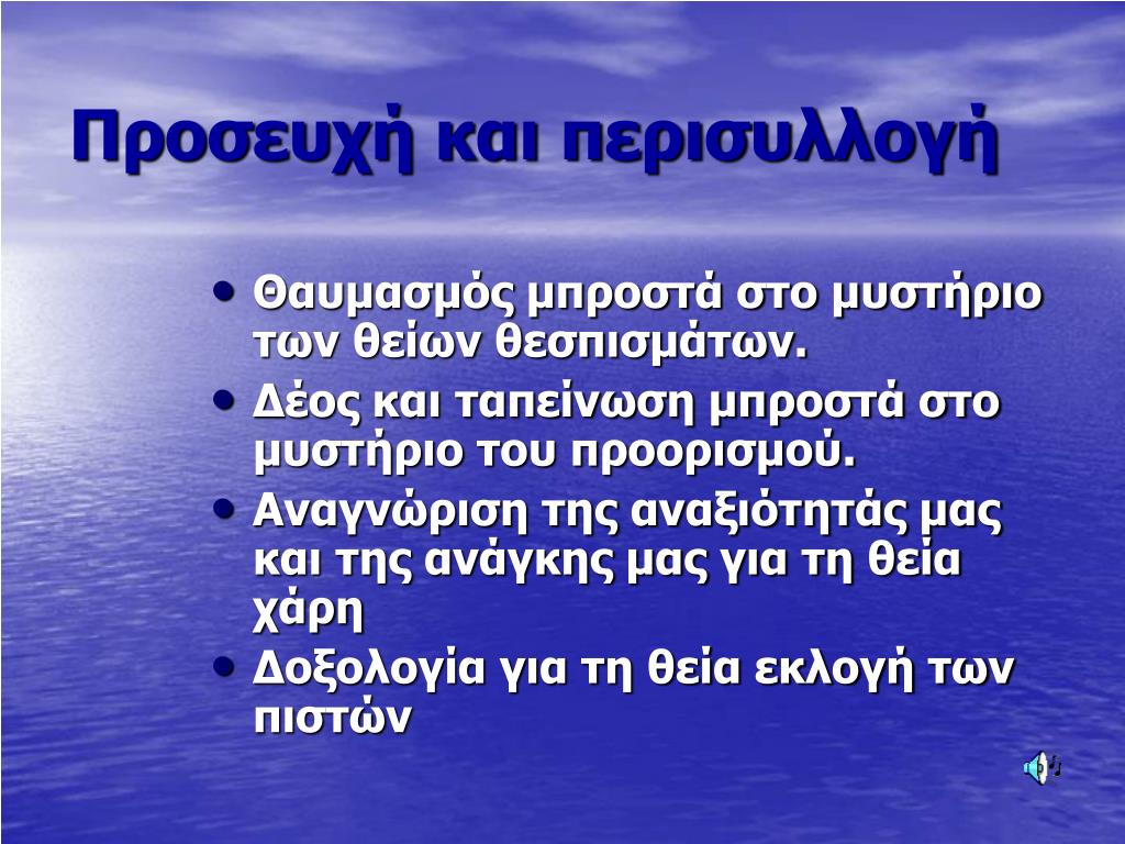 Προσευχή και περισυλλογή • Θαυμασμός μπροστά στο μυστήριο των θείων θεσπισμάτων. • Δέος και ταπείνωση μπροστά στο μυστήριο του προορισμού. • Αναγνώριση της αναξιότητάς μας και της ανάγκης μας για τη θεία χάρη • Δοξολογία για τη θεία εκλογή των πιστών