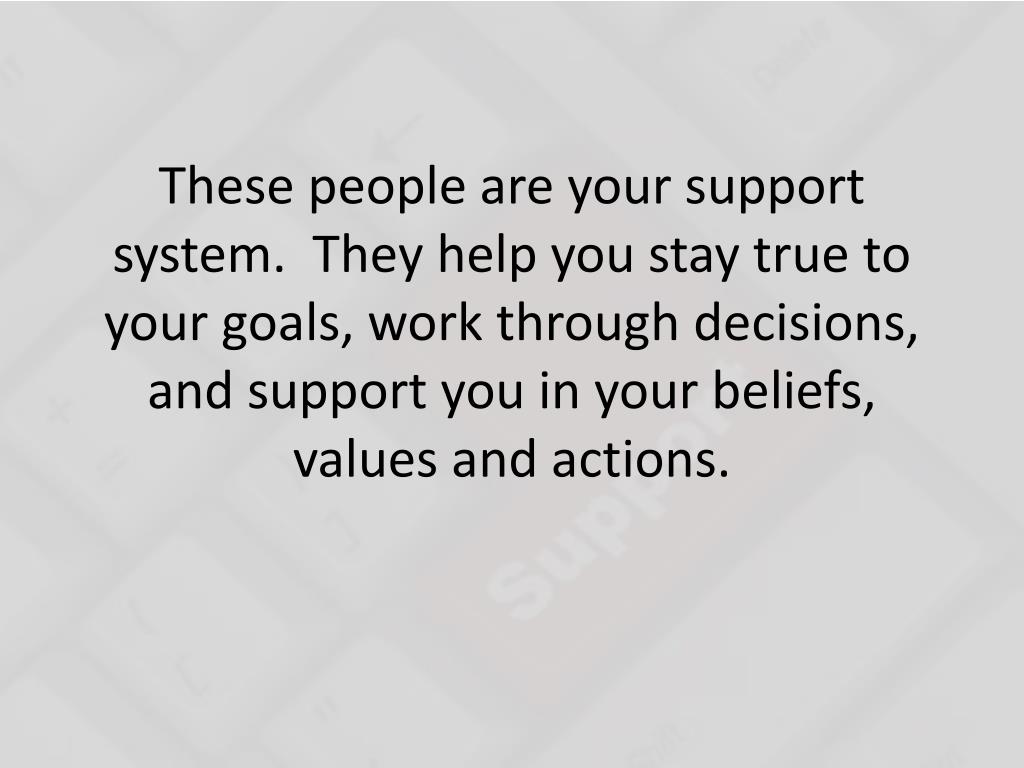 These people are your support system. They help you stay true to your goals, work through decisions, and support you in your beliefs, values and actions.