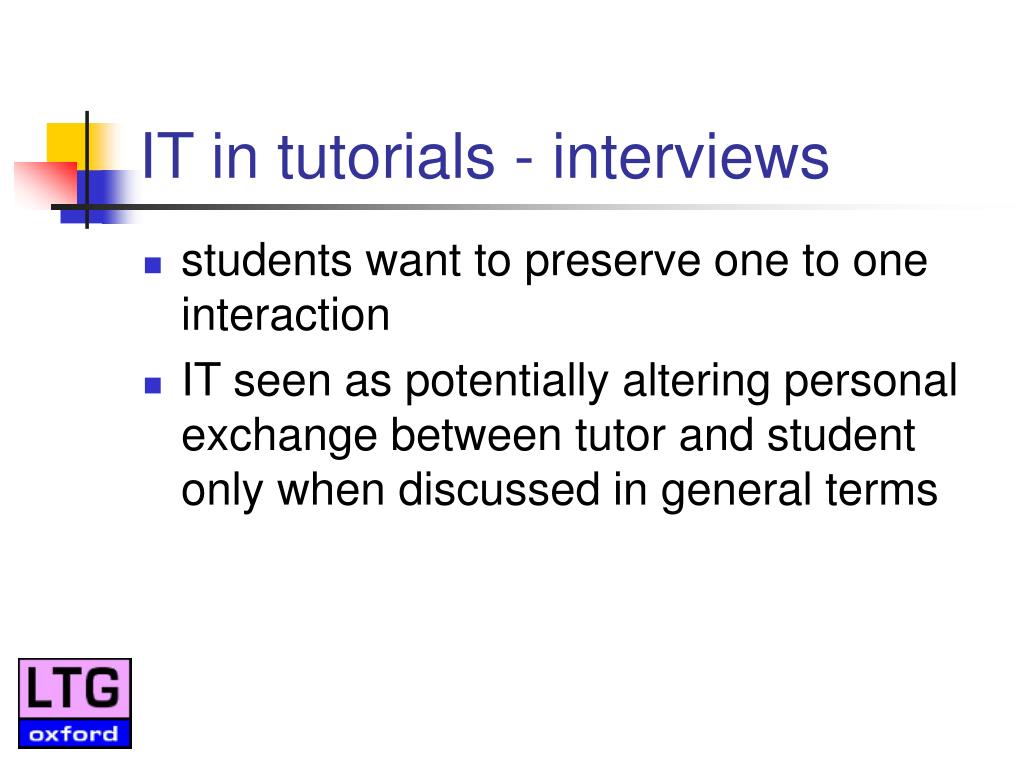 IT in tutorials - interviews • students want to preserve one to one interaction • IT seen as potentially altering personal exchange between tutor and student only when discussed in general terms