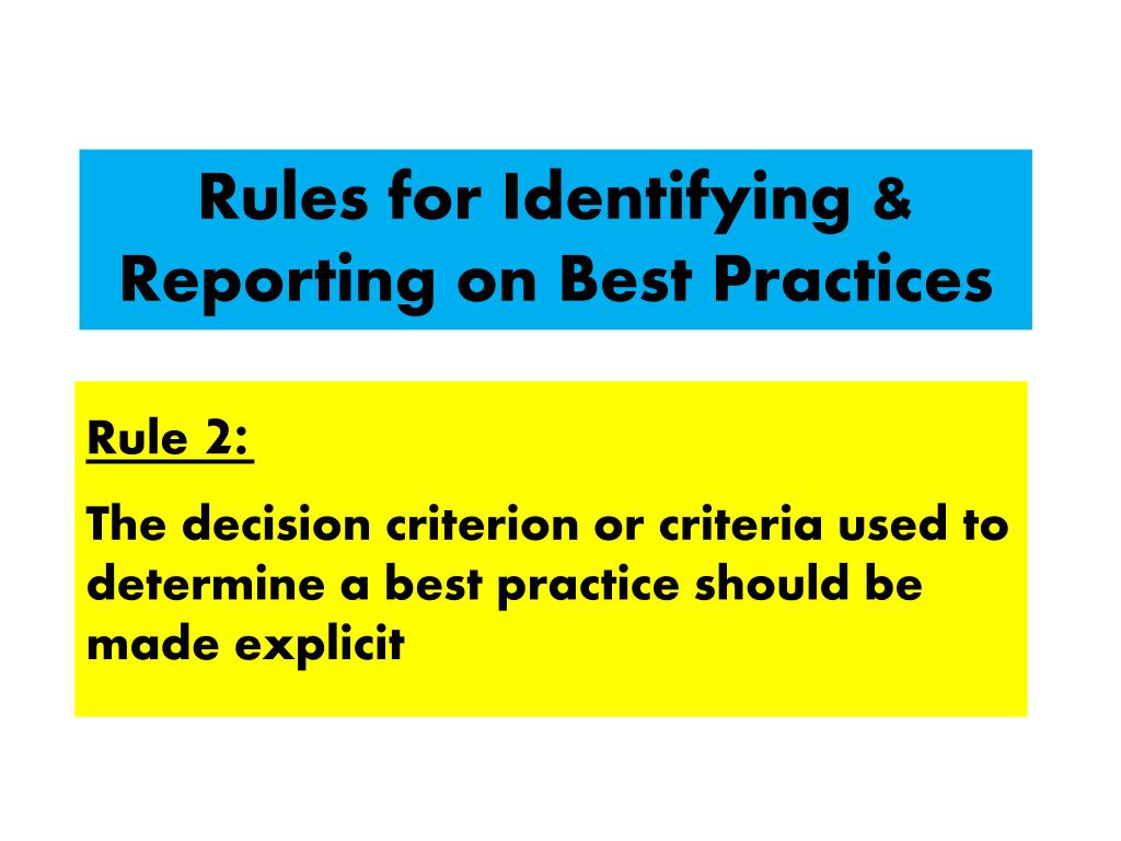 Rules for Identifying & Reporting on Best Practices • Rule 2: • The decision criterion or criteria used to determine a best practice should be made explicit