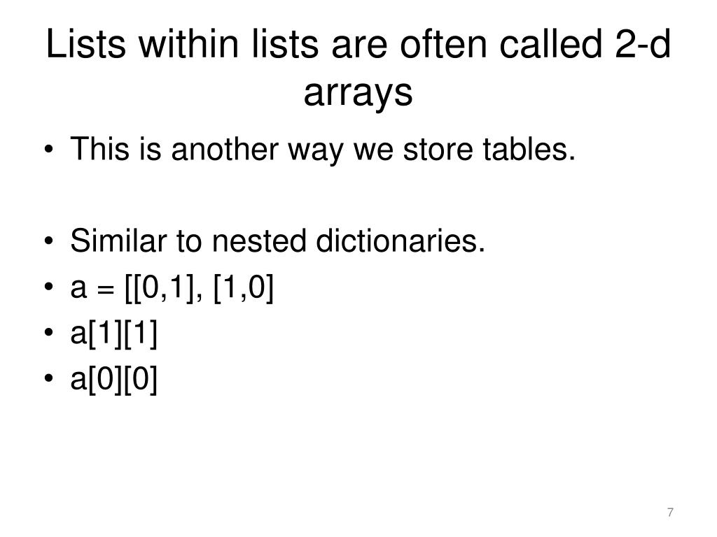 Lists within lists are often called 2-d arrays This is another way we store tables. Similar to nested dictionaries. a = [[0,1], [1,0] a[1][1] a[0][0]