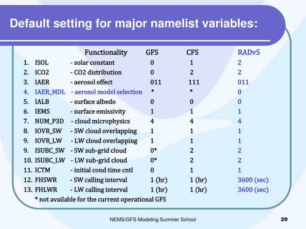 Default setting for major namelist variables: Functionality GFS CFS RADv5 1. ISOL - solar constant 0 1 2 2. ICO2 - CO2 distribution 0 2 2 3. IAER - aerosol effect 011 111 011 4. IAER_MDL - aerosol model selection * * 0 5. IALB - surface albedo 0 0 0 6. IEMS - surface emissivity 1 1 1 7. NUM_P3D - cloud microphysics 4 4 4 8. IOVR_SW - SW cloud overlapping 1 1 1 9. IOVR_LW - LW cloud overlapping 1 1 1 9. ISUBC_SW - SW sub-grid cloud 0* 2 2 10. ISUBC_LW - LW sub-grid cloud 0* 2 2 11. ICTM - initial cond time cntl 0 1 1 12. FHSWR - SW calling interval 1 (hr) 1 (hr) 3600 (sec) 13. FHLWR - LW calling interval 1 (hr) 1 (hr) 3600 (sec) * not available for the current operational GFS NEMS/GFS Modeling Summer School