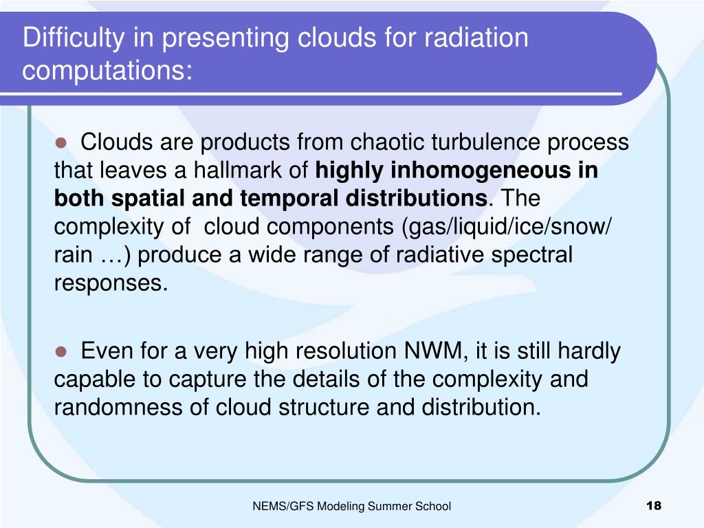 Difficulty in presenting clouds for radiation computations: • Clouds are products from chaotic turbulence process that leaves a hallmark of highly inhomogeneous in both spatial and temporal distributions. The complexity of cloud components (gas/liquid/ice/snow/ rain …) produce a wide range of radiative spectral responses. • Even for a very high resolution NWM, it is still hardly capable to capture the details of the complexity and randomness of cloud structure and distribution. NEMS/GFS Modeling Summer School
