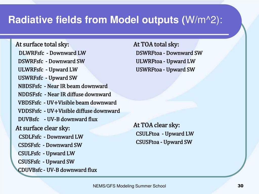 Radiative fields from Model outputs (W/m^2): At TOA total sky: DSWRFtoa - Downward SW ULWRFtoa - Upward LW USWRFtoa - Upward SW At TOA clear sky: CSULFtoa - Upward LW CSUSFtoa - Upward SW At surface total sky: DLWRFsfc - Downward LW DSWRFsfc - Downward SW ULWRFsfc - Upward LW USWRFsfc - Upward SW NBDSFsfc - Near IR beam downward NDDSFsfc - Near IR diffuse downward VBDSFsfc - UV+Visible beam downward VDDSFsfc - UV+Visible diffuse downward DUVBsfc - UV-B downward flux At surface clear sky: CSDLFsfc - Downward LW CSDSFsfc - Downward SW CSULFsfc - Upward LW CSUSFsfc - Upward SW CDUVBsfc - UV-B downward flux NEMS/GFS Modeling Summer School