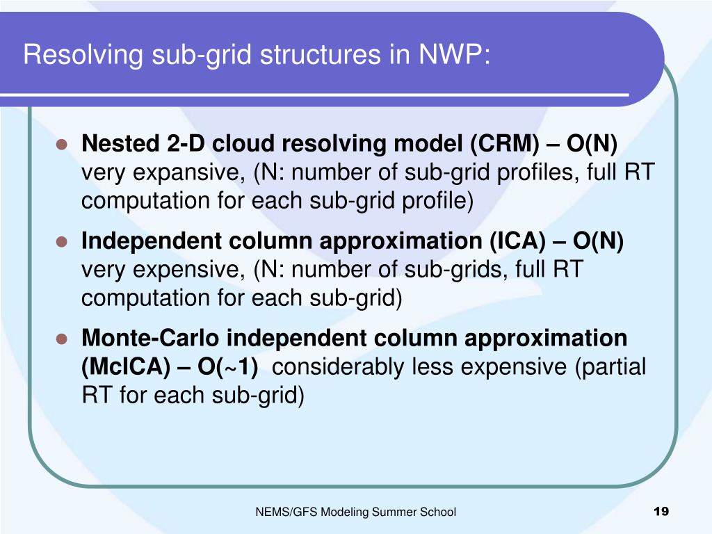 Resolving sub-grid structures in NWP: • Nested 2-D cloud resolving model (CRM) – O(N) very expansive, (N: number of sub-grid profiles, full RT computation for each sub-grid profile) • Independent column approximation (ICA) – O(N) very expensive, (N: number of sub-grids, full RT computation for each sub-grid) • Monte-Carlo independent column approximation (McICA) – O(~1)considerably less expensive (partial RT for each sub-grid) NEMS/GFS Modeling Summer School