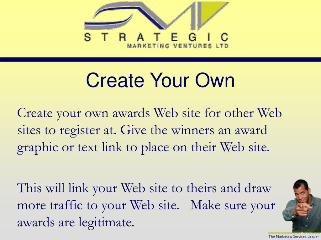 Create Your Own Create your own awards Web site for other Web sites to register at. Give the winners an award graphic or text link to place on their Web site. This will link your Web site to theirs and draw more traffic to your Web site. Make sure your awards are legitimate.