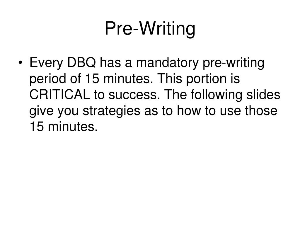 Pre-Writing • Every DBQ has a mandatory pre-writing period of 15 minutes. This portion is CRITICAL to success. The following slides give you strategies as to how to use those 15 minutes.