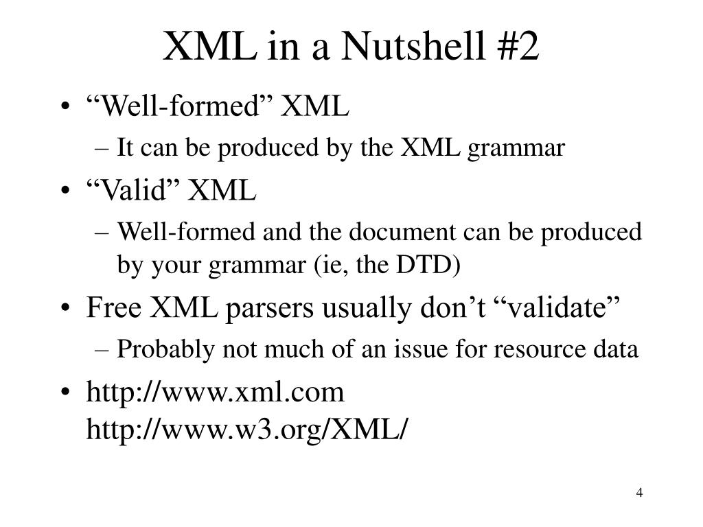 XML in a Nutshell #2 • “Well-formed” XML • It can be produced by the XML grammar • “Valid” XML • Well-formed and the document can be produced by your grammar (ie, the DTD) • Free XML parsers usually don’t “validate” • Probably not much of an issue for resource data • http://www.xml.com http://www.w3.org/XML/