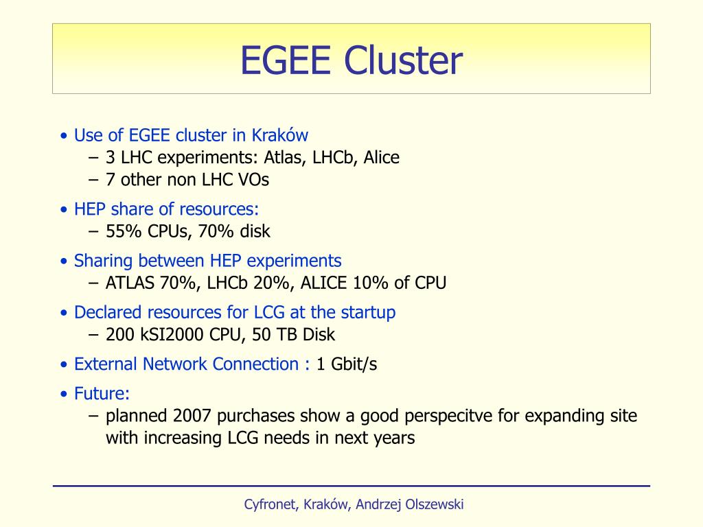 EGEE Cluster • Use of EGEE cluster in Kraków • 3 LHC experiments: Atlas, LHCb, Alice • 7other non LHC VOs • HEP share of resources: • 55% CPUs, 70% disk • Sharing between HEP experiments • ATLAS 70%, LHCb 20%, ALICE 10% of CPU • Declared resources for LCG at the startup • 200 kSI2000 CPU, 50 TB Disk • External Network Connection : 1 Gbit/s • Future: • planned 2007 purchases show a good perspecitve for expanding site with increasing LCG needs in next years Cyfronet, Kraków, Andrzej Olszewski