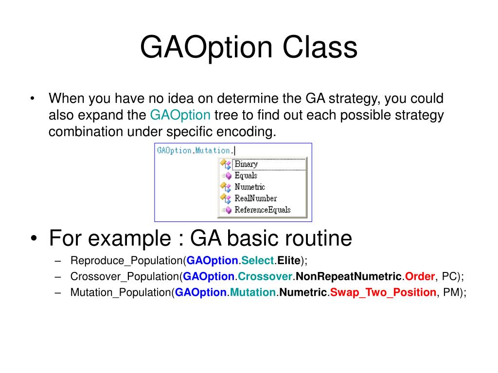 GAOption Class • When you have no idea on determine the GA strategy, you could also expand the GAOption tree to find out each possible strategy combination under specific encoding. • For example : GA basic routine • Reproduce_Population(GAOption.Select.Elite); • Crossover_Population(GAOption.Crossover.NonRepeatNumetric.Order, PC); • Mutation_Population(GAOption.Mutation.Numetric.Swap_Two_Position, PM);