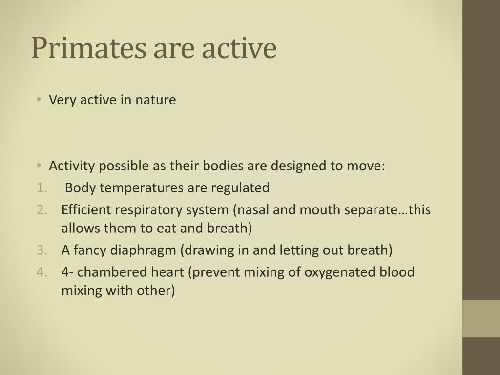 Primates are active • Very active in nature • Activity possible as their bodies are designed to move: • Body temperatures are regulated • Efficient respiratory system (nasal and mouth separate…this allows them to eat and breath) • A fancy diaphragm (drawing in and letting out breath) • 4- chambered heart (prevent mixing of oxygenated blood mixing with other)