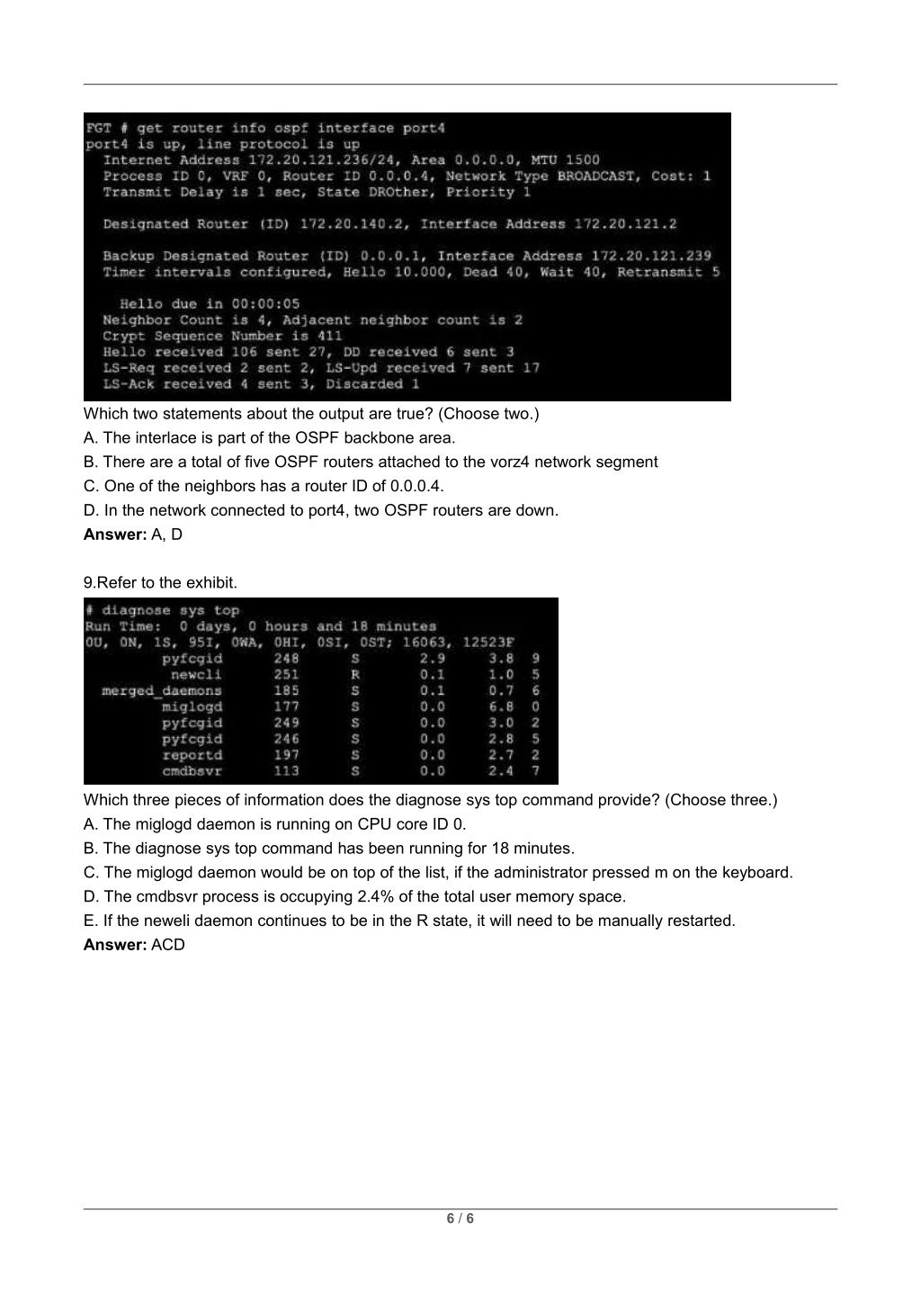 Which two statements about the output are true? (Choose two.) A. The interlace is part of the OSPF backbone area. B. There are a total of five OSPF routers attached to the vorz4 network segment C. One of the neighbors has a router ID of 0.0.0.4. D. In the network connected to port4, two OSPF routers are down. Answer: A, D 9.Refer to the exhibit. Which three pieces of information does the diagnose sys top command provide? (Choose three.) A. The miglogd daemon is running on CPU core ID 0. B. The diagnose sys top command has been running for 18 minutes. C. The miglogd daemon would be on top of the list, if the administrator pressed m on the keyboard. D. The cmdbsvr process is occupying 2.4% of the total user memory space. E. If the neweli daemon continues to be in the R state, it will need to be manually restarted. Answer: ACD 6 / 6