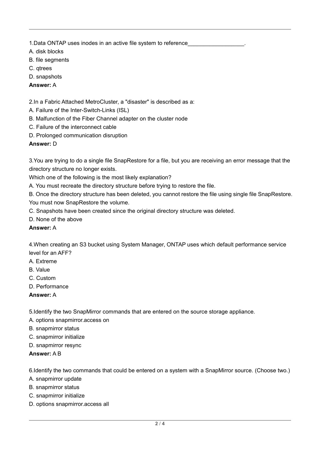 1.Data ONTAP uses inodes in an active file system to reference__________________. A. disk blocks B. file segments C. qtrees D. snapshots Answer: A 2.In a Fabric Attached MetroCluster, a "disaster" is described as a: A. Failure of the Inter-Switch-Links (ISL) B. Malfunction of the Fiber Channel adapter on the cluster node C. Failure of the interconnect cable D. Prolonged communication disruption Answer: D 3.You are trying to do a single file SnapRestore for a file, but you are receiving an error message that the directory structure no longer exists. Which one of the following is the most likely explanation? A. You must recreate the directory structure before trying to restore the file. B. Once the directory structure has been deleted, you cannot restore the file using single file SnapRestore. You must now SnapRestore the volume. C. Snapshots have been created since the original directory structure was deleted. D. None of the above Answer: A 4.When creating an S3 bucket using System Manager, ONTAP uses which default performance service level for an AFF? A. Extreme B. Value C. Custom D. Performance Answer: A 5.Identify the two SnapMirror commands that are entered on the source storage appliance. A. options snapmirror.access on B. snapmirror status C. snapmirror initialize D. snapmirror resync Answer: A B 6.Identify the two commands that could be entered on a system with a SnapMirror source. (Choose two.) A. snapmirror update B. snapmirror status C. snapmirror initialize D. options snapmirror.access all 2 / 4