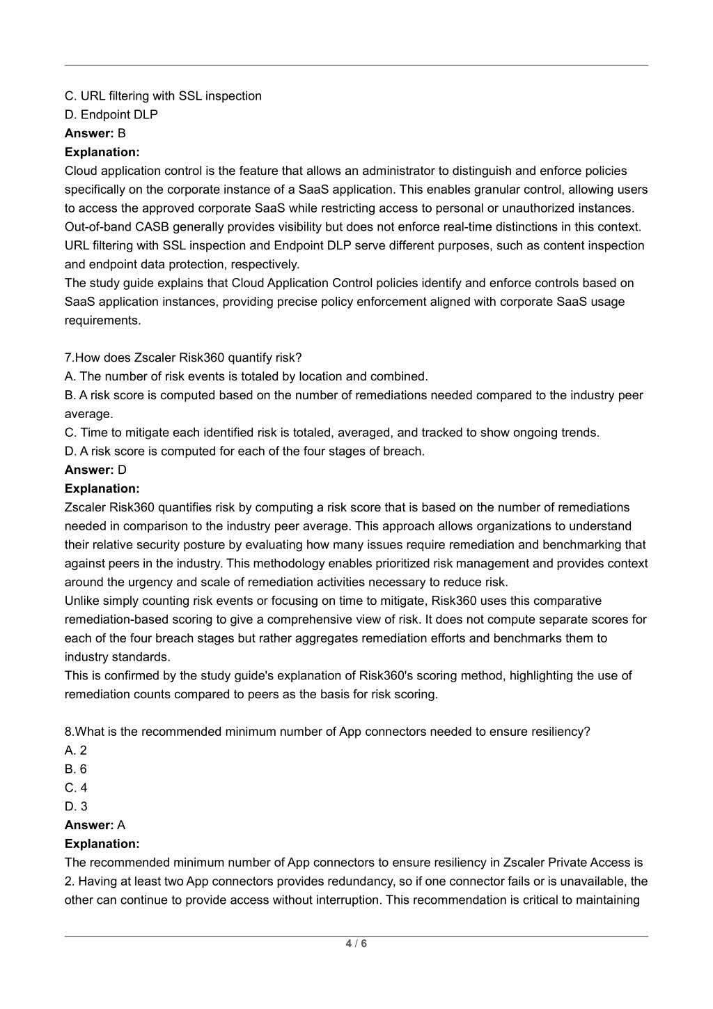 C. URL filtering with SSL inspection D. Endpoint DLP Answer: B Explanation: Cloud application control is the feature that allows an administrator to distinguish and enforce policies specifically on the corporate instance of a SaaS application. This enables granular control, allowing users to access the approved corporate SaaS while restricting access to personal or unauthorized instances. Out-of-band CASB generally provides visibility but does not enforce real-time distinctions in this context. URL filtering with SSL inspection and Endpoint DLP serve different purposes, such as content inspection and endpoint data protection, respectively. The study guide explains that Cloud Application Control policies identify and enforce controls based on SaaS application instances, providing precise policy enforcement aligned with corporate SaaS usage requirements. 7.How does Zscaler Risk360 quantify risk? A. The number of risk events is totaled by location and combined. B. A risk score is computed based on the number of remediations needed compared to the industry peer average. C. Time to mitigate each identified risk is totaled, averaged, and tracked to show ongoing trends. D. A risk score is computed for each of the four stages of breach. Answer: D Explanation: Zscaler Risk360 quantifies risk by computing a risk score that is based on the number of remediations needed in comparison to the industry peer average. This approach allows organizations to understand their relative security posture by evaluating how many issues require remediation and benchmarking that against peers in the industry. This methodology enables prioritized risk management and provides context around the urgency and scale of remediation activities necessary to reduce risk. Unlike simply counting risk events or focusing on time to mitigate, Risk360 uses this comparative remediation-based scoring to give a comprehensive view of risk. It does not compute separate scores for each of the four breach stages but rather aggregates remediation efforts and benchmarks them to industry standards. This is confirmed by the study guide's explanation of Risk360's scoring method, highlighting the use of remediation counts compared to peers as the basis for risk scoring. 8.What is the recommended minimum number of App connectors needed to ensure resiliency? A. 2 B. 6 C. 4 D. 3 Answer: A Explanation: The recommended minimum number of App connectors to ensure resiliency in Zscaler Private Access is 2. Having at least two App connectors provides redundancy, so if one connector fails or is unavailable, the other can continue to provide access without interruption. This recommendation is critical to maintaining 4 / 6