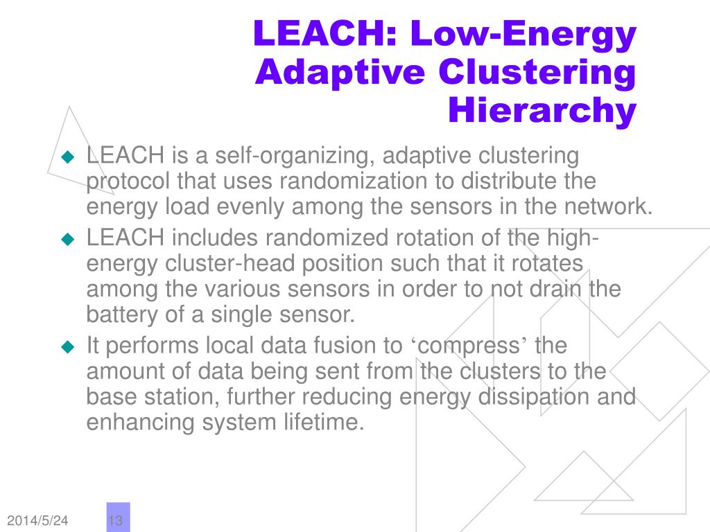 LEACH: Low-Energy Adaptive Clustering Hierarchy • LEACH is a self-organizing, adaptive clustering protocol that uses randomization to distribute the energy load evenly among the sensors in the network. • LEACH includes randomized rotation of the high-energy cluster-head position such that it rotates among the various sensors in order to not drain the battery of a single sensor. • It performs local data fusion to ‘compress’ the amount of data being sent from the clusters to the base station, further reducing energy dissipation and enhancing system lifetime.