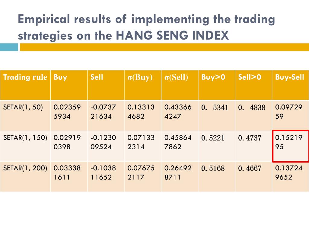Empirical results of implementing the trading strategies on the HANG SENG INDEX