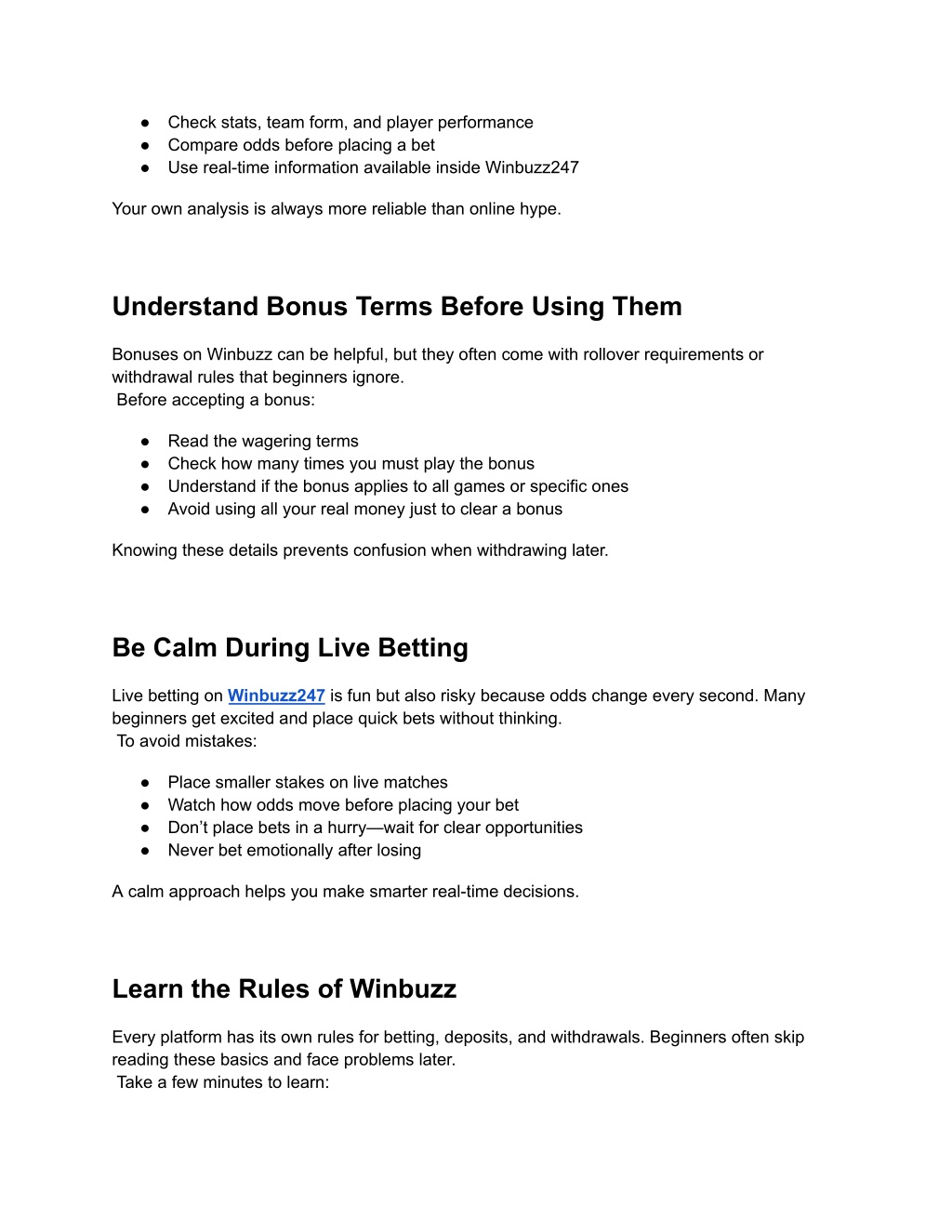 3. ● Check stats, team form, and player performance ● Compare odds before placing a bet ● Use real-time information available inside Winbuzz247 Your own analysis is always more reliable than online hype. Understand Bonus Terms Before Using Them Bonuses on Winbuzz can be helpful, but they often come with rollover requirements or withdrawal rules that beginners ignore. Before accepting a bonus: ● Read the wagering terms ● Check how many times you must play the bonus ● Understand if the bonus applies to all games or specific ones ● Avoid using all your real money just to clear a bonus Knowing these details prevents confusion when withdrawing later. Be Calm During Live Betting Live betting on Winbuzz247 is fun but also risky because odds change every second. Many beginners get excited and place quick bets without thinking. To avoid mistakes: ● Place smaller stakes on live matches ● Watch how odds move before placing your bet ● Don’t place bets in a hurry—wait for clear opportunities ● Never bet emotionally after losing A calm approach helps you make smarter real-time decisions. Learn the Rules of Winbuzz Every platform has its own rules for betting, deposits, and withdrawals. Beginners often skip reading these basics and face problems later. Take a few minutes to learn: