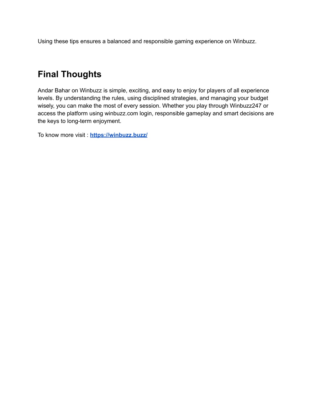 Using these tips ensures a balanced and responsible gaming experience on Winbuzz. Final Thoughts Andar Bahar on Winbuzz is simple, exciting, and easy to enjoy for players of all experience levels. By understanding the rules, using disciplined strategies, and managing your budget wisely, you can make the most of every session. Whether you play through Winbuzz247 or access the platform using winbuzz.com login, responsible gameplay and smart decisions are the keys to long-term enjoyment. To know more visit : https://winbuzz.buzz/