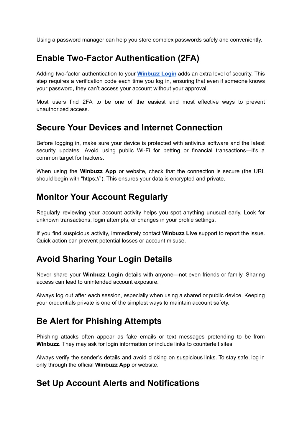Using a password manager can help you store complex passwords safely and conveniently. Enable Two-Factor Authentication (2FA) Adding two-factor authentication to your Winbuzz Login adds an extra level of security. This step requires a verification code each time you log in, ensuring that even if someone knows your password, they can’t access your account without your approval. Most users find 2FA to be one of the easiest and most effective ways to prevent unauthorized access. Secure Your Devices and Internet Connection Before logging in, make sure your device is protected with antivirus software and the latest security updates. Avoid using public Wi-Fi for betting or financial transactions—it’s a common target for hackers. When using the Winbuzz App or website, check that the connection is secure (the URL should begin with “https://”). This ensures your data is encrypted and private. Monitor Your Account Regularly Regularly reviewing your account activity helps you spot anything unusual early. Look for unknown transactions, login attempts, or changes in your profile settings. If you find suspicious activity, immediately contact Winbuzz Live support to report the issue. Quick action can prevent potential losses or account misuse. Avoid Sharing Your Login Details Never share your Winbuzz Login details with anyone—not even friends or family. Sharing access can lead to unintended account exposure. Always log out after each session, especially when using a shared or public device. Keeping your credentials private is one of the simplest ways to maintain account safety. Be Alert for Phishing Attempts Phishing attacks often appear as fake emails or text messages pretending to be from Winbuzz. They may ask for login information or include links to counterfeit sites. Always verify the sender’s details and avoid clicking on suspicious links. To stay safe, log in only through the official Winbuzz App or website. Set Up Account Alerts and Notifications