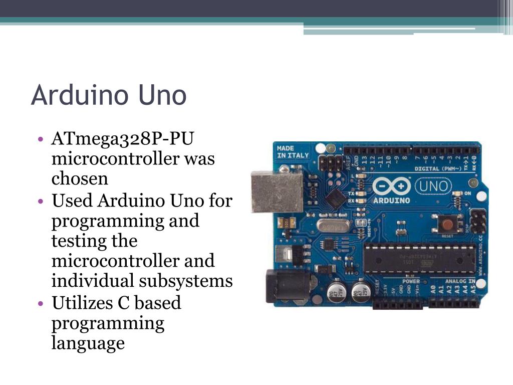 Arduino Uno • ATmega328P-PU microcontroller was chosen • Used Arduino Uno for programming and testing the microcontroller and individual subsystems • Utilizes C based programming language