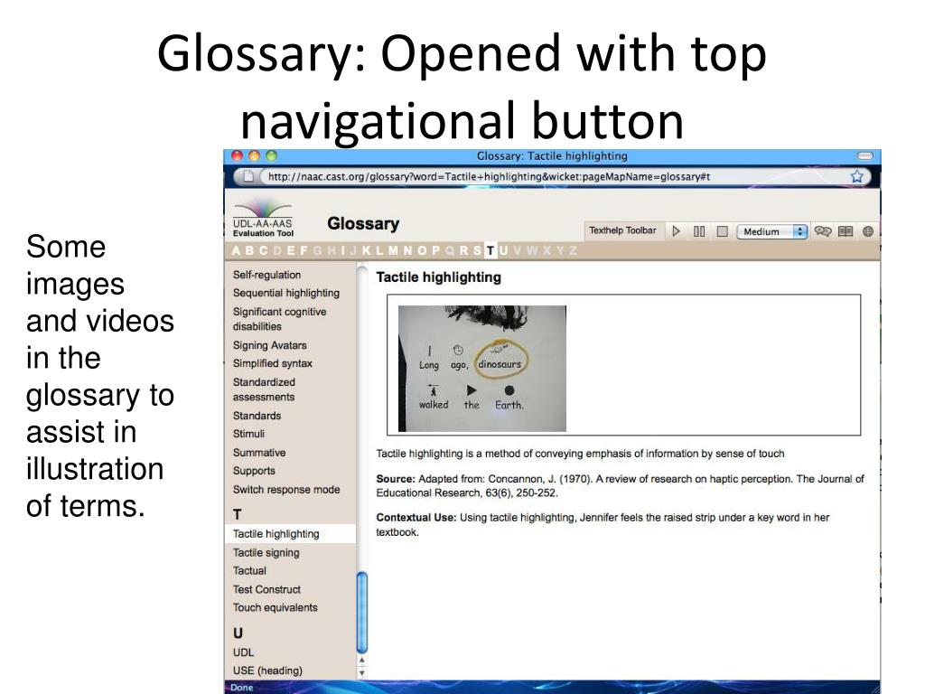 Glossary: Opened with top navigational button Some images and videos in the glossary to assist in illustration of terms.