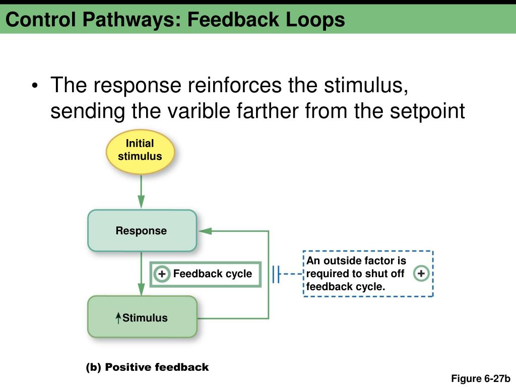 Control Pathways: Feedback Loops • The response reinforces the stimulus, sending the varible farther from the setpoint Initial stimulus Response An outside factor is required to shut off feedback cycle. Feedback cycle Stimulus (b) Positive feedback Figure 6-27b