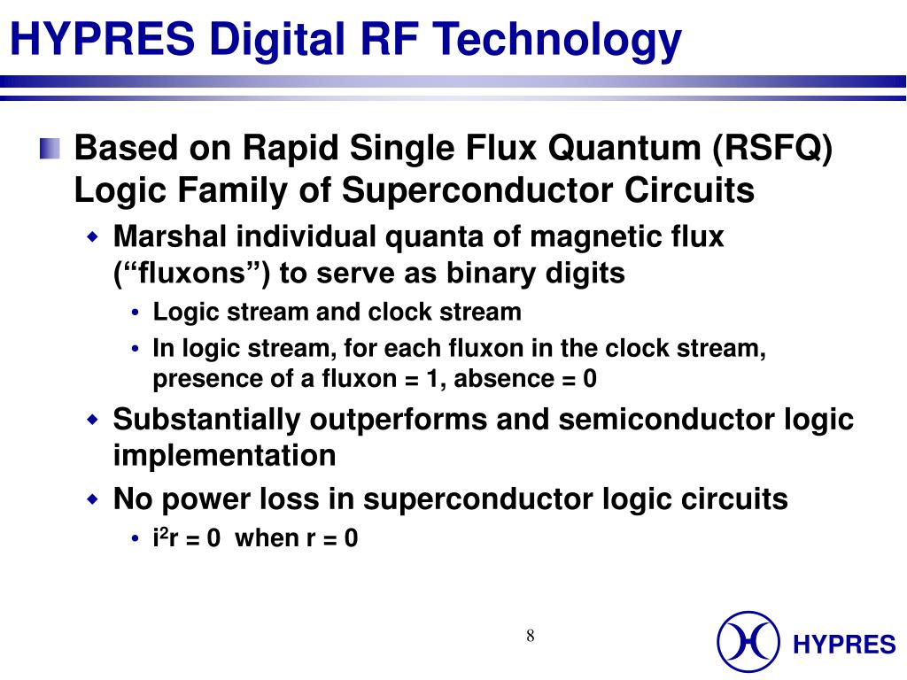 HYPRES Digital RF Technology • Based on Rapid Single Flux Quantum (RSFQ) Logic Family of Superconductor Circuits • Marshal individual quanta of magnetic flux (“fluxons”) to serve as binary digits • Logic stream and clock stream • In logic stream, for each fluxon in the clock stream, presence of a fluxon = 1, absence = 0 • Substantially outperforms and semiconductor logic implementation • No power loss in superconductor logic circuits • i2r = 0 when r = 0