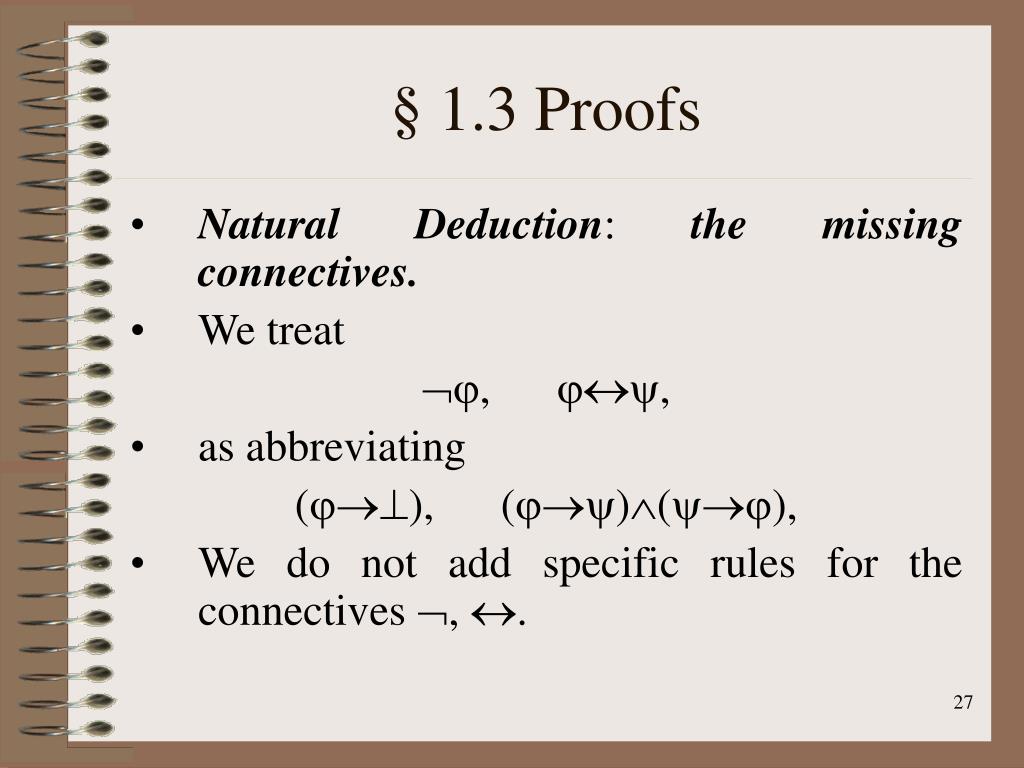 § 1.3 Proofs • Natural Deduction: the missing connectives. • We treat , , • as abbreviating (), ()(), • We do not add specific rules for the connectives , .