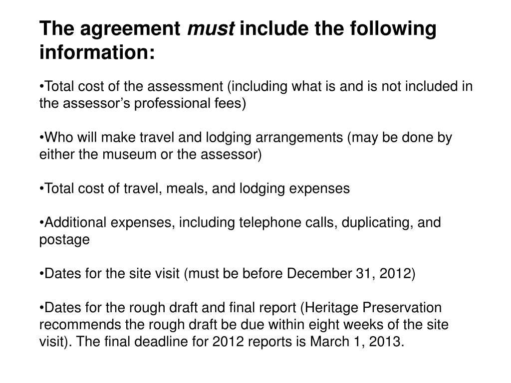 The agreement must include the following information: • Total cost of the assessment (including what is and is not included in the assessor’s professional fees) • Who will make travel and lodging arrangements (may be done by either the museum or the assessor) • Total cost of travel, meals, and lodging expenses • Additional expenses, including telephone calls, duplicating, and postage • Dates for the site visit (must be before December 31, 2012) • Dates for the rough draft and final report (Heritage Preservation recommends the rough draft be due within eight weeks of the site visit). The final deadline for 2012 reports is March 1, 2013.