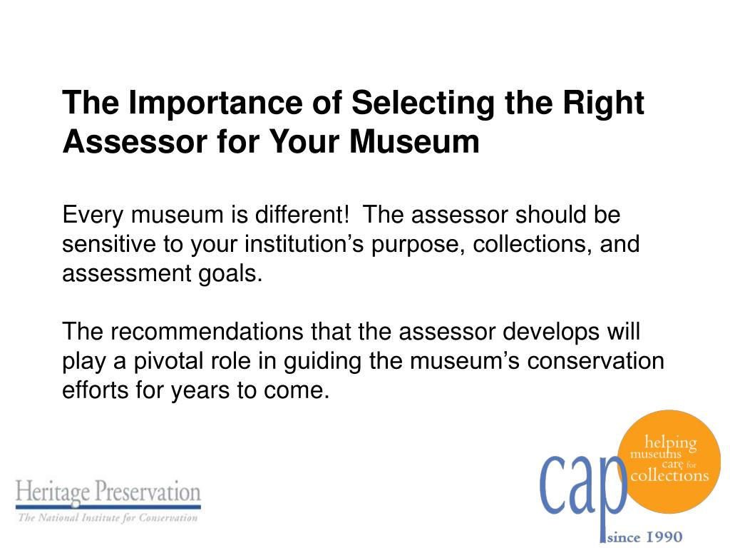 The Importance of Selecting the Right Assessor for Your Museum Every museum is different! The assessor should be sensitive to your institution’s purpose, collections, and assessment goals. The recommendations that the assessor develops will play a pivotal role in guiding the museum’s conservation efforts for years to come.