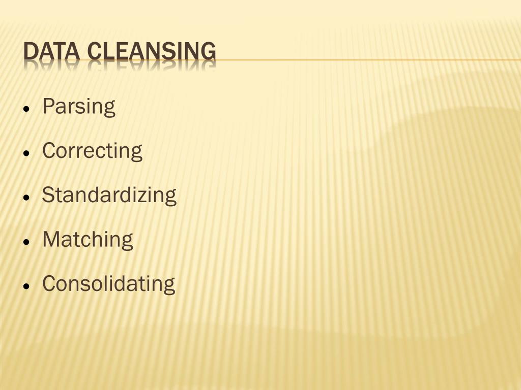 Parsing • Correcting • Standardizing • Matching • Consolidating Data Cleansing