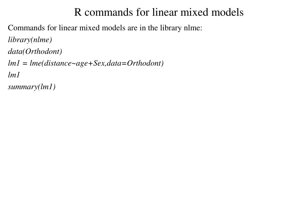 R commands for linear mixed models Commands for linear mixed models are in the library nlme: library(nlme) data(Orthodont) lm1 = lme(distance~age+Sex,data=Orthodont) lm1 summary(lm1)