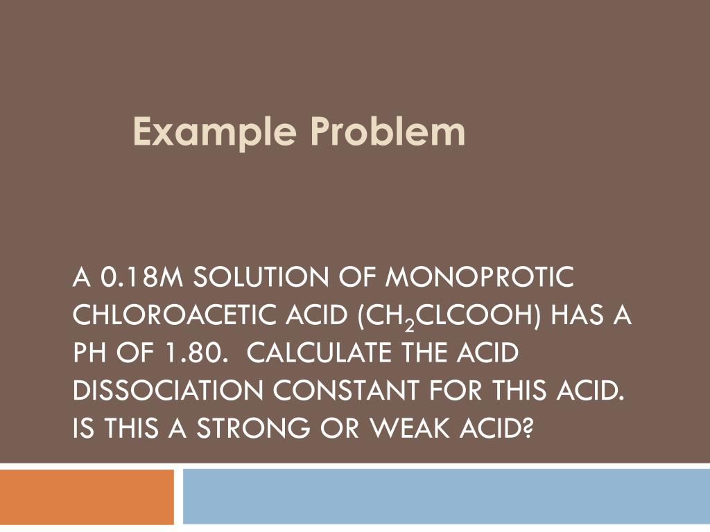 A 0.18M solution of monoproticchloroacetic acid (CH2ClCOOH) has a pH of 1.80. Calculate the acid dissociation constant for this acid. Is this a strong or weak acid? Example Problem