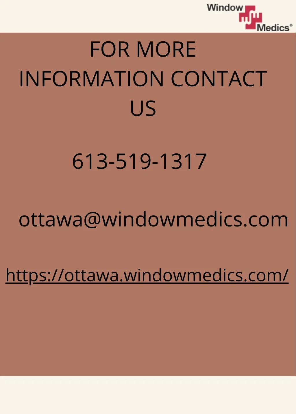 FOR MORE INFORMATION CONTACT US 613-519-1317 ottawa@windowmedics.com https://ottawa.windowmedics.com/