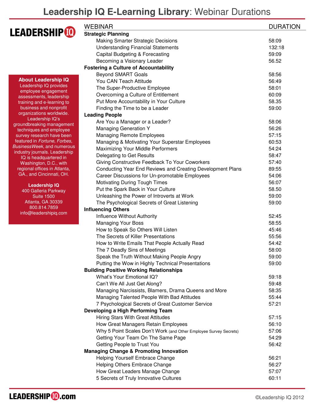 Leadership IQ E-Learning Library: Webinar Durations About Leadership IQ Leadership IQ provides employee engagement assessments, leadership training and e-learning to business and nonprofit organizations worldwide. Leadership IQ’s groundbreaking management techniques and employee survey research have been featured in Fortune, Forbes, BusinessWeek, and numerous industry journals. Leadership IQ is headquartered in Washington, D.C., with regional offices in Atlanta, GA., and Cincinnati, OH. Leadership IQ400 Galleria Parkway Suite 1500 Atlanta, GA 30339800.814.7859info@leadershipiq.com