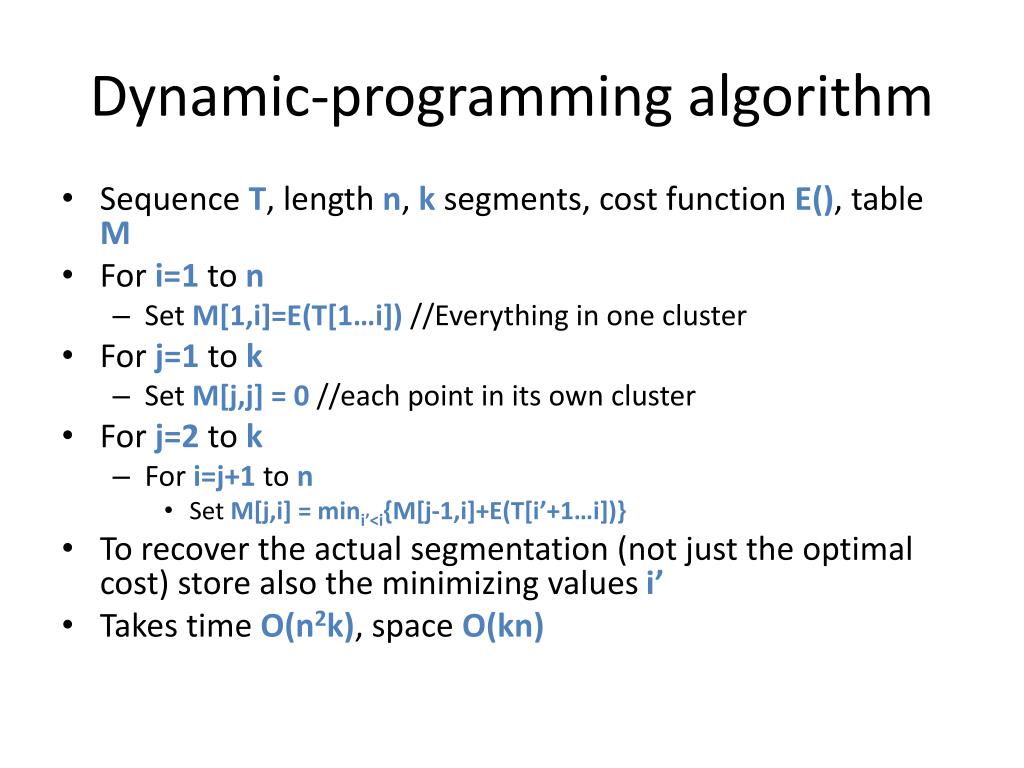 Dynamic-programming algorithm • Sequence T, length n, k segments, cost function E(), table M • For i=1 to n • Set M[1,i]=E(T[1…i])//Everything in one cluster • For j=1 to k • Set M[j,j] = 0 //each point in its own cluster • For j=2 to k • For i=j+1 to n • Set M[j,i] = mini’<i{M[j-1,i]+E(T[i’+1…i])} • To recover the actual segmentation (not just the optimal cost) store also the minimizing values i’ • Takes time O(n2k), space O(kn)