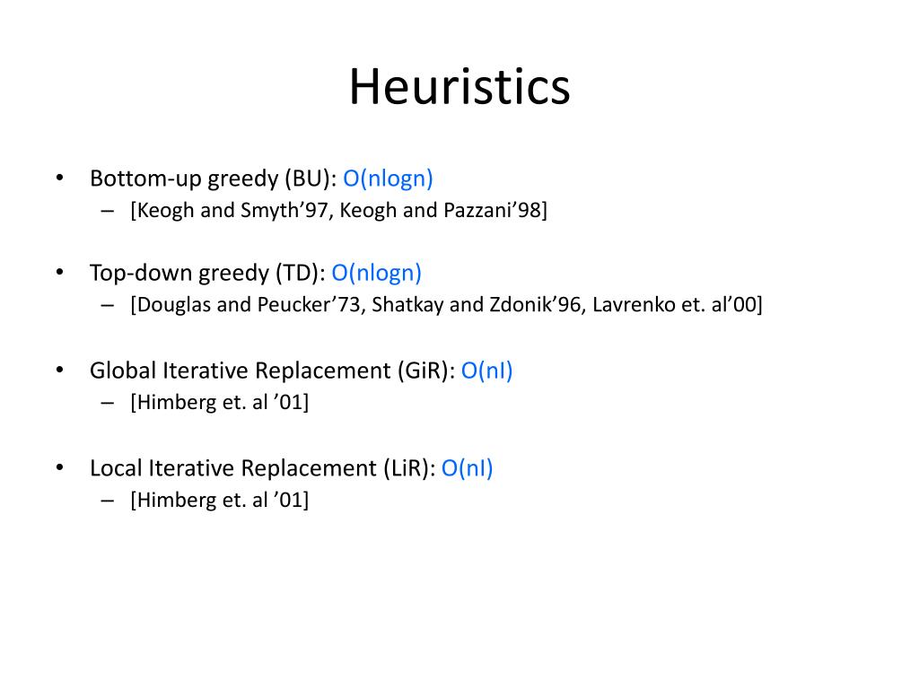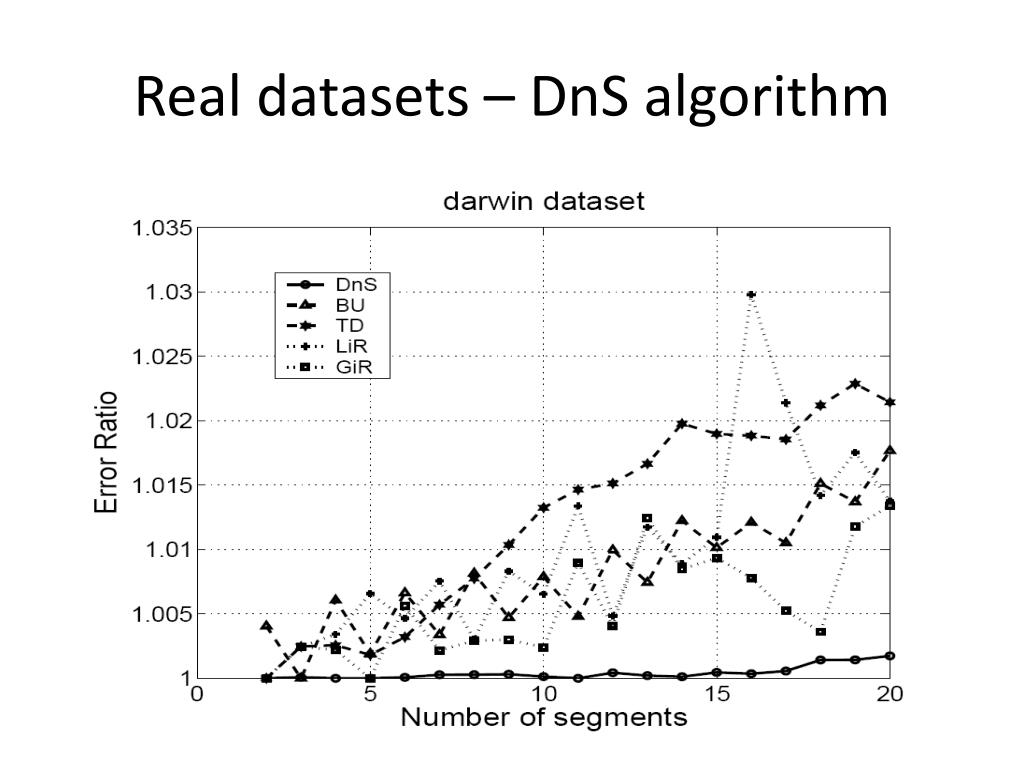 Heuristics • Bottom-up greedy (BU): O(nlogn) • [Keogh and Smyth’97, Keogh and Pazzani’98] • Top-down greedy (TD): O(nlogn) • [Douglas and Peucker’73, Shatkay and Zdonik’96, Lavrenko et. al’00] • Global Iterative Replacement (GiR): O(nI) • [Himberg et. al ’01] • Local Iterative Replacement (LiR): O(nI) • [Himberg et. al ’01]