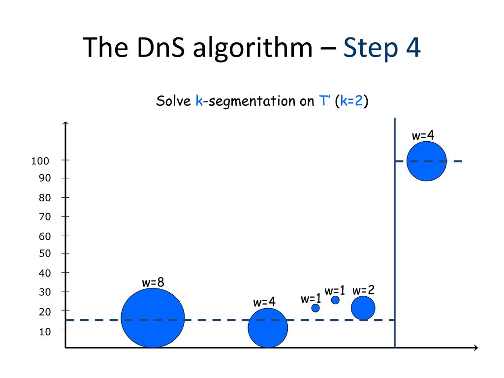 The DnS algorithm – Step 4 Solve k-segmentation on T’(k=2) w=4 100 90 80 70 60 50 40 w=8 w=2 w=1 30 w=1 w=4 20 10