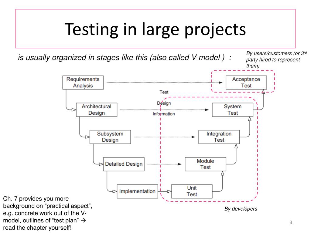 Testing in large projects By users/customers (or 3rd party hired to represent them) is usually organized in stages like this (also called V-model ) : Ch. 7 provides you more background on “practical aspect”, e.g. concrete work out of the V-model, outlines of “test plan” read the chapter yourself! By developers