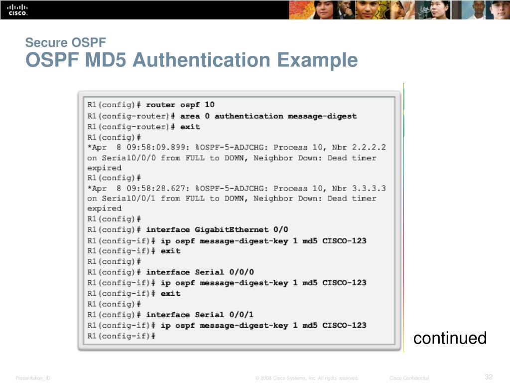 Secure OSPFSecure Routing Updates • When neighbor authentication has been configured on a router, the router authenticates the source of each routing update packet that it receives. • An authenticating key that is known to both the sending and the receiving route is exchanged. • OSPF supports three types of authentication: • Null– no authentication. • Simple password authentication – the password in the update is sent in plaintext over the network (outdated method). • MD5 authentication – Most secure and recommended method of authentication. Password is calculated using the MD5 algorithm.